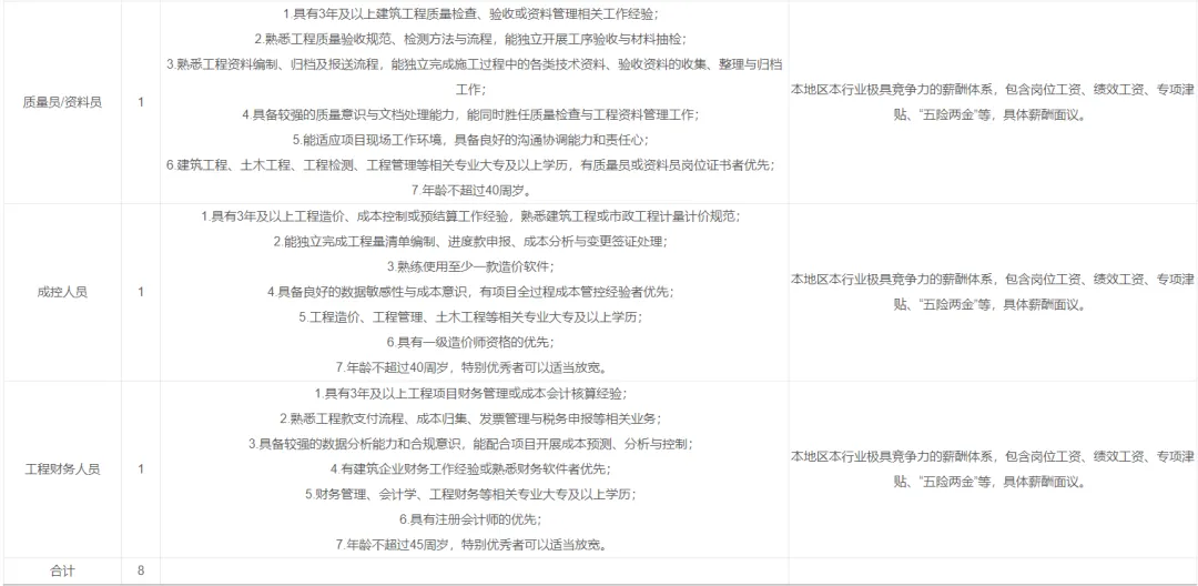 本次招聘工程建设管理技术人员8人,招聘的岗位、资格条件及其它情况详见《郴州市设计建设集团有限公司2026年招聘工程建设管理技术人员岗位表》。