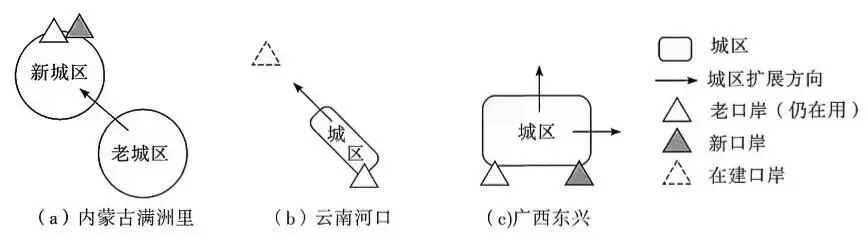 边境口岸城市是我国对外开放的前沿,口岸与城市互动,形成各具特色的“口岸—城市空间形态”。近年来,我国边境口岸城市陆续增设新口岸。下图示意三个边境口岸城市的“口岸—城市空间形态”。据此完成3~5题。