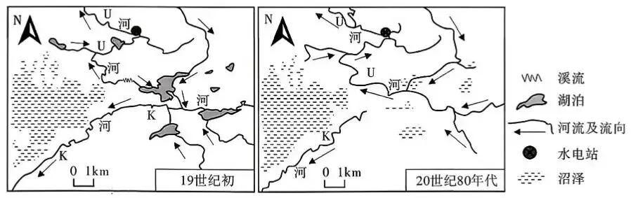 19世纪初期,东欧平原东北部的 U河与K河分水岭处有一条溪流发育,维持着两河水量平衡。1840年春季,大量洪水下泄将U河上游水坝冲毁,导致两河间的分水岭被完全切穿。至20世纪80年代,K河上游湖泊群逐渐消亡。下图示意该地水系演变事件。据此完成9~11题。