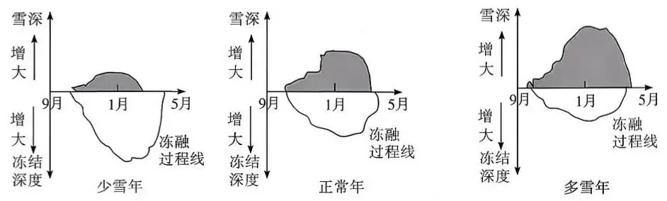 新疆北部阿尔泰山冬季多雪,季节性冻土广泛分布于海拔2000 m以下地区。地表积雪特征与该地土壤冻融过程关系密切。下图示意阿尔泰山不同年份冬季地表积雪过程和土壤冻融过程。据此完成12~13题。