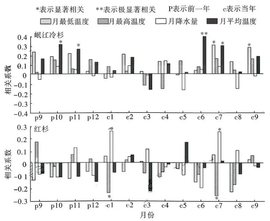 14.岷江冷杉和红杉径向生长与月气候因子的相关性表现为