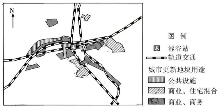(1)指出2005年以来涩谷站周边地区城市更新地块功能的分布特点。(4分)