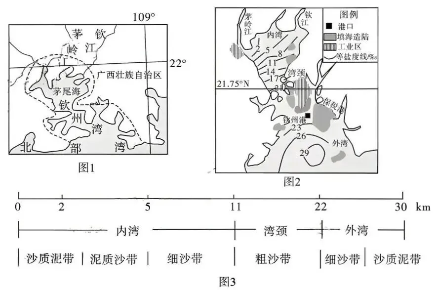 钦州湾位于北部湾中部,是一个半封闭型天然河口海湾,由内湾(茅尾海)和外湾(钦州湾)及湾颈(连接两湾的潮汐通道)构成。观察发现内湾海面高度呈现明显的季节变化。外湾呈喇叭型,口朝东南,受潮流影响,涨潮流弱于落潮流,沉积物粒度呈现出西部粗、东部细的分布格局;湾颈处海岸基岩裸露,受波浪作用较强,海岸不同程度地受到侵蚀后退。图1为钦州湾位置示意图,图2为夏季钦州湾盐度分布图,图3为沉积物从内湾向外湾变化图。