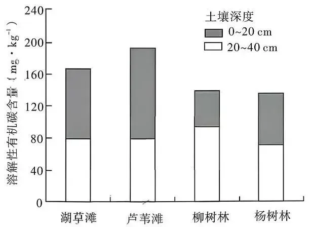 土壤溶解性有机碳主要来源于植被枯枝落叶的分解产物、根系分泌物等。河湖交汇区是养分的聚集地带,常呈现出多植被类型覆盖现象。洪泽湖河湖交汇区在自然演替和人工抚育基础上,随水位周期性变化,逐渐形成湖草滩—芦苇滩——柳树林——杨树林的植被覆盖结构。下图示意洪泽湖河湖交汇区不同植被覆盖土壤溶解性有机碳含量分布。