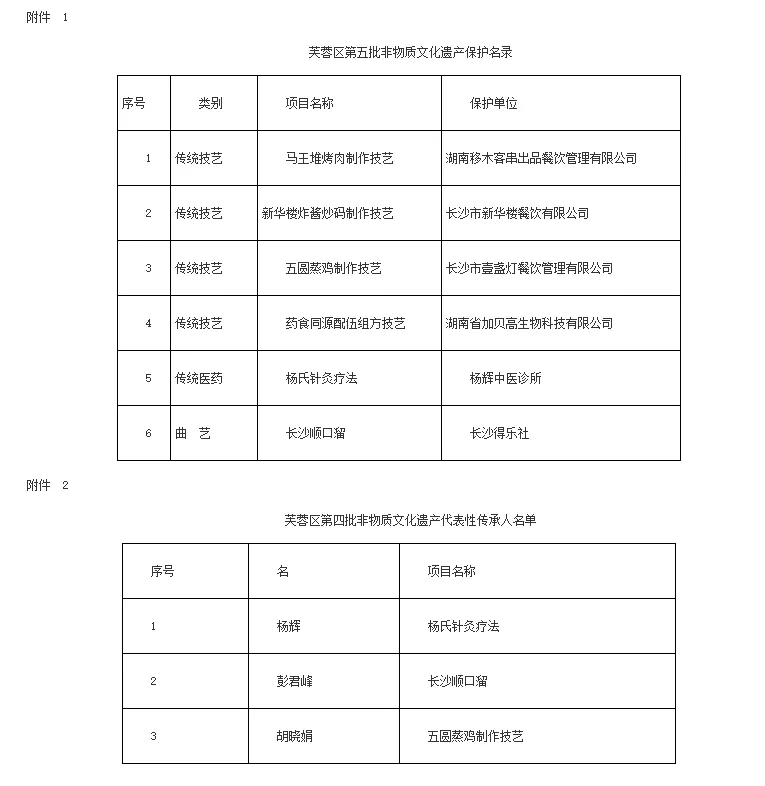 芙蓉区文化旅游体育局发布《关于公示芙蓉区第五批非物质文化遗产保护名录及第四批非物质文化遗产代表性传承人名单的公告》