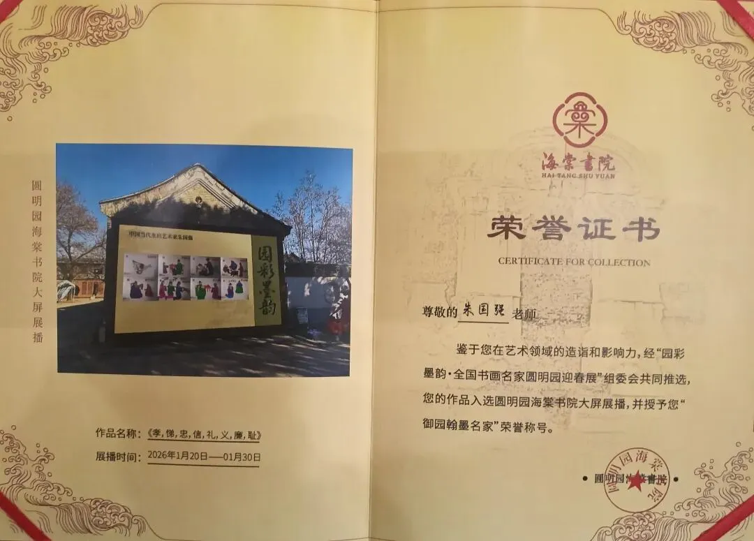 近日,经“园彩墨韵·全国书画名家圆明园迎春展”组委会共同推选,长沙皮影戏省级代表性传承人朱国强作品《孝,悌,忠,信,礼,义,廉,耻》入选圆明园海棠书院大屏展播,朱国强被授予“御园翰墨名家”荣誉称号。