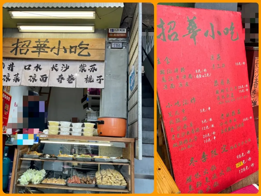 这里叫招华小吃,门面不大,一楼是门面和制作间,旁边那个楼梯上去是可以堂食用餐的地方。他家小吃主要是小时候老长沙的炸炸炸、凉菜、凉粉凉面等,很适合下午打腰餐(通俗的说就是下午茶垫肚子,哈哈。)