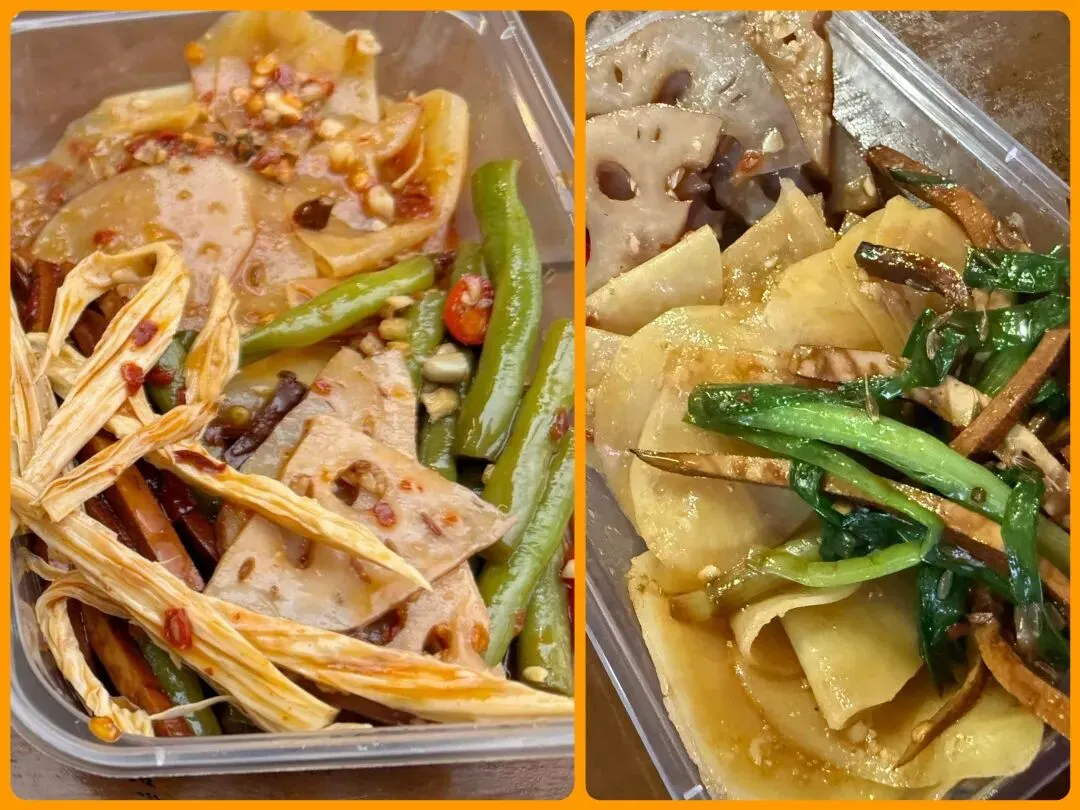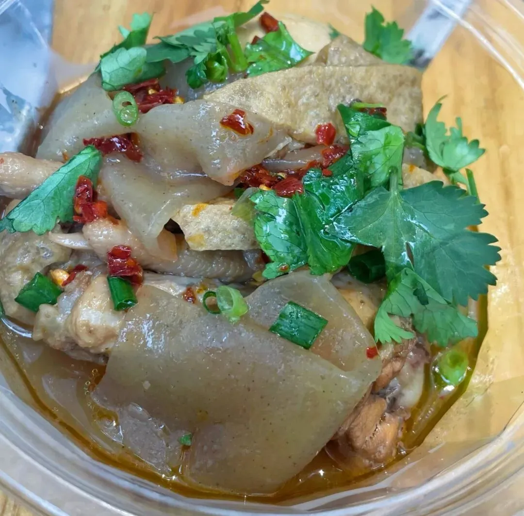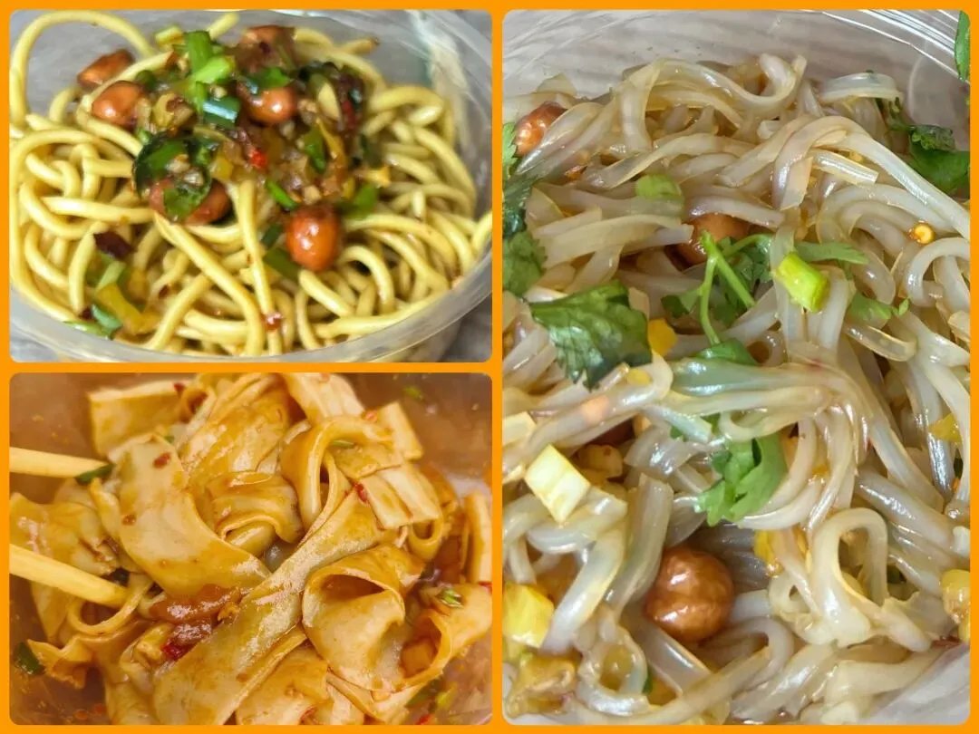 热卤拼盘,兰花干子、鸡爪、鸡翅根、魔芋……每样来点儿,放点辣椒油和芹菜叶子,入味,满足。炸炸炸,里脊肉、包菜、淀粉肠,学校门口油炸货的标配,辣椒油是灵魂,他家味道也不错。炸春卷,也可以,比很多大店都好吃,但是个人还是觉得北正街森無牛肉串的春卷最好吃,哈哈。素凉拌,一般也是集中凉拌素菜拼一份,每样都可以试点味。喜欢他家的凉拌菜,孜然和辣椒的香,就是小时候的感觉,没有七七八八的调料味堆砌。凉面、凉皮、刮凉粉,三样之中,个人最喜欢他家的凉粉,细软弹滑的口感很好吃;凉皮比较薄,也是我喜欢的口感。凉面味道也可以,只是我喜欢像乔伯那种更细一点的面,所以一般吃的话就会吃他家的凉粉或者凉皮。