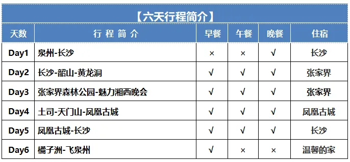 ◎【门票】:橘子洲电瓶车+韶山环保车+张家界国家森林公园+百龙电梯单程天子山缆车单程+魅力湘西晚会普座+黄龙洞+天门山含扶梯鞋套+凤凰古城换乘车(此报价按景区优惠门票核算,任何人群和证件都无优惠退费)