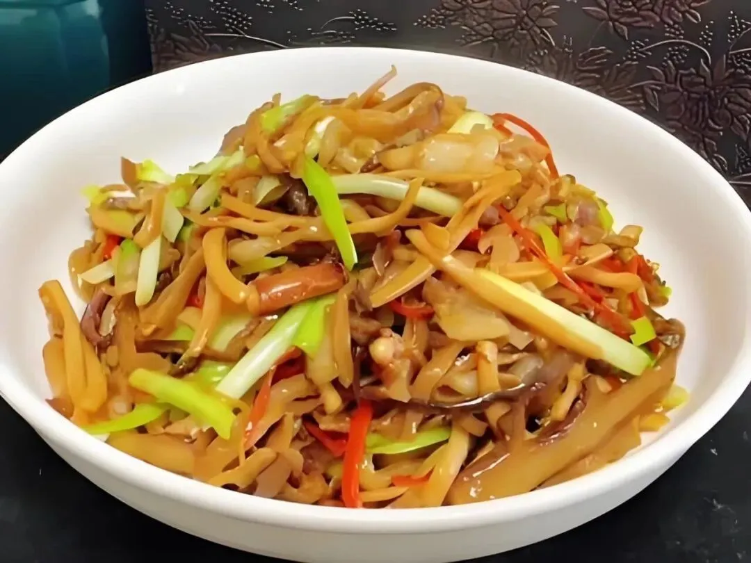 烟笋丝、肉丝、鱿鱼合炒。鱿谐音游,竹笋分节。寓意“游刃有余,节节高升”。