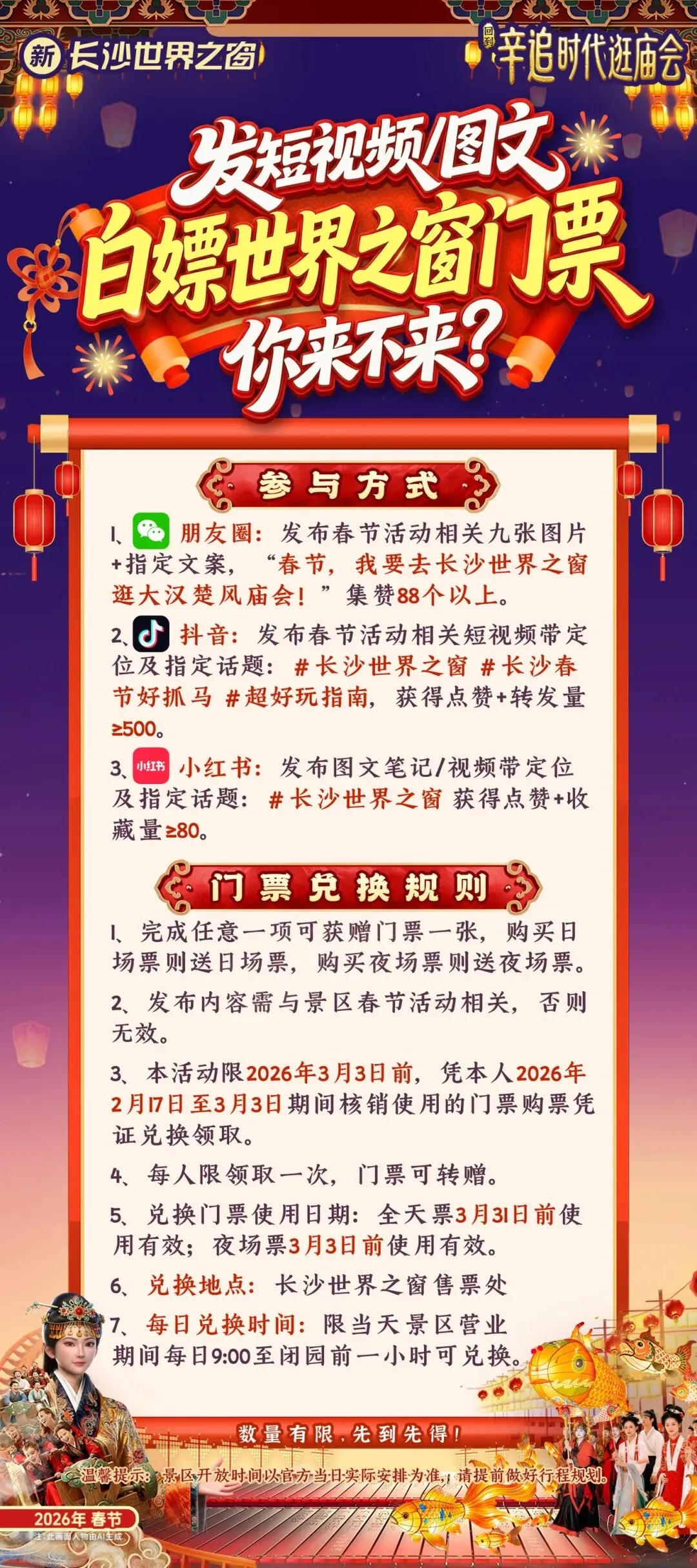 ✅抖音:带话题#长沙世界之窗,点赞+转发≥500