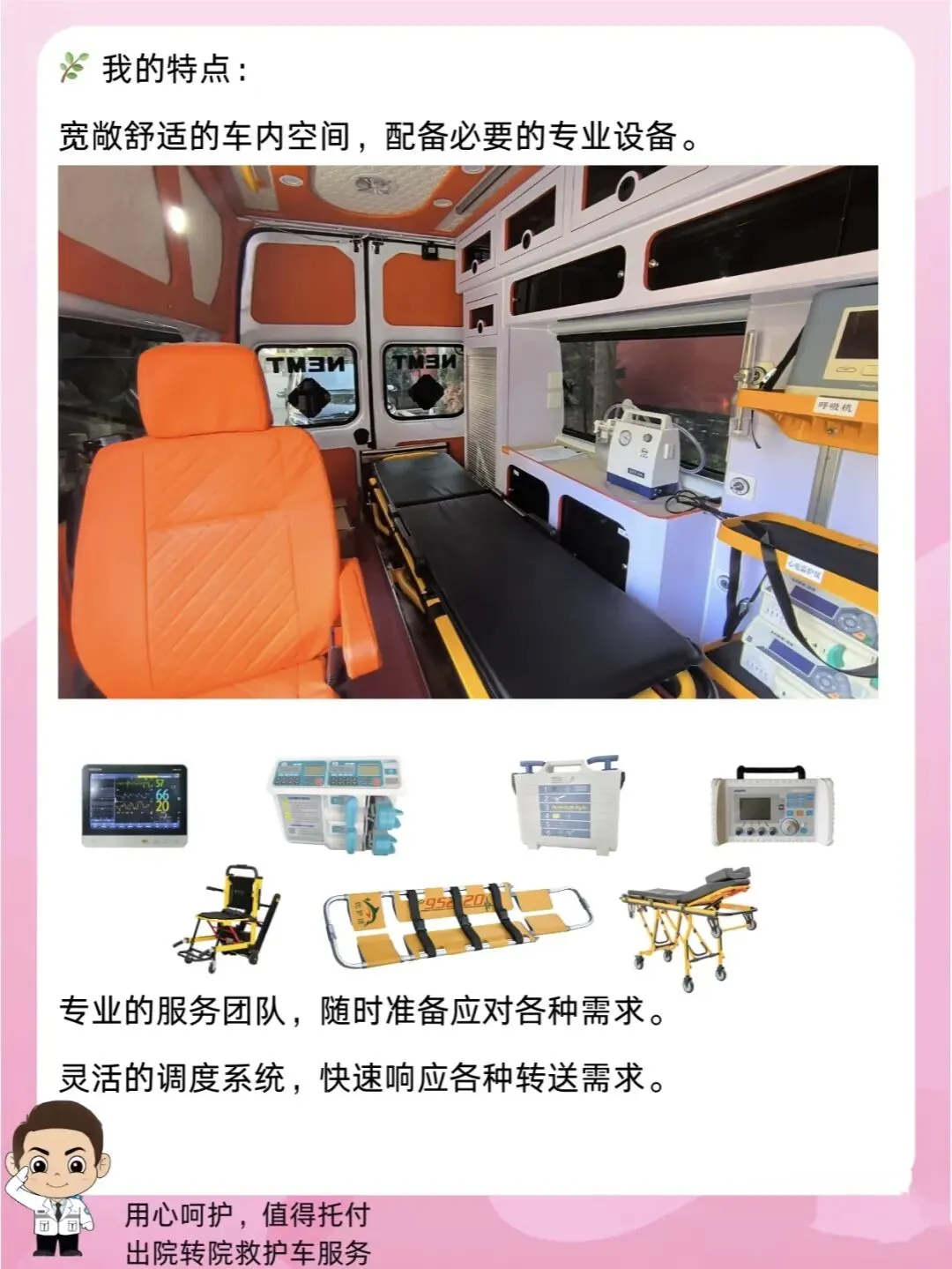 专业随车团队 + 标准化医疗设备 + 全流程安全保障,致力于让每一次转运都成为一次安心、舒适的旅程。