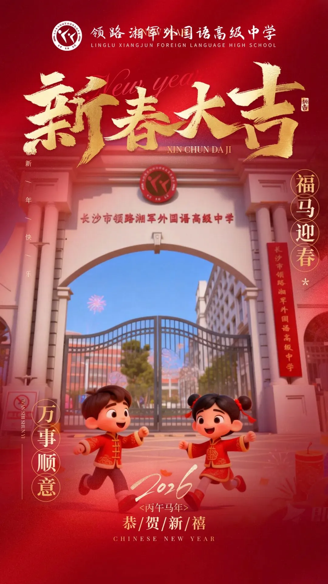 值此辞旧迎新之际,长沙市领路湘军外国语高级中学向全体师生、家长及各界友人致以诚挚的节日祝福!