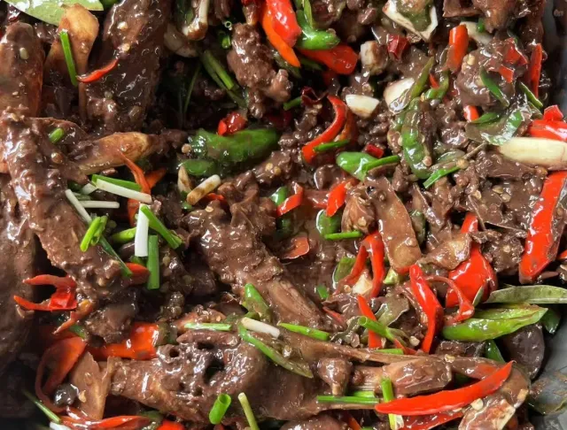 说起这血酱鸭,做法讲究一个“快”字。鸭肉切小块爆炒,炒到香气往鼻子里钻的时候,把调好的鸭血——一定要是新鲜流动的血,混着醋和水,猛地泼下去。火要大,手要快,让每一块肉都被血浆紧紧裹住。出锅时,肉嫩血鲜,一勺子浇在白米饭上,那滋味,能让你连干三碗饭。