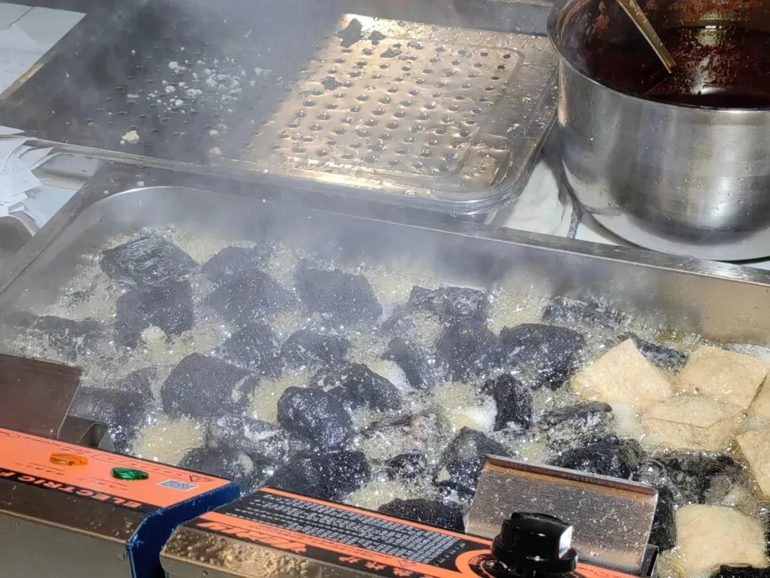 糖油粑粑,很像是油炸的粘面糖糕。不论是南方还是北方,中国人总是善于运用煎煮烹炸醋溜涮等各种方式,用相近的食材做出花样百出的小吃。长沙臭豆腐,黑白双拼,一个味道,尝过算是来过长沙了吧