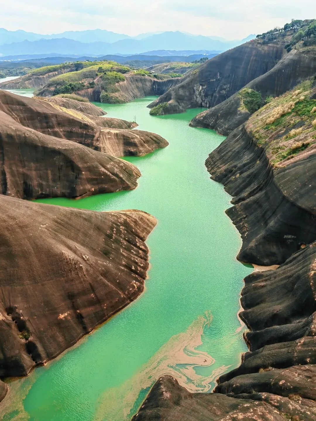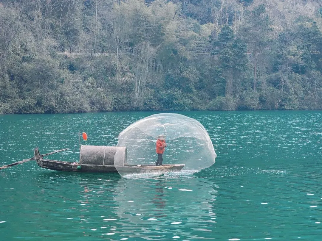 巨蜥湖,仔细盯着看上一会儿,就会有巨物恐惧症的幻觉,仿佛巨蜥下一刻就要从水中抬起巨大的脑袋。这里与韶关丹霞山相似又不同,是奇特的水上丹霞地貌