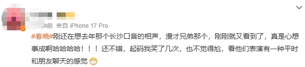 据了解,来自长沙的徐浩伦、谭湘文自2021年搭档至今,从长沙笑工场小剧场起步,逐步登上湖南卫视《哈哈请上车》《火星情报局》等热门综艺,曾以“漫才兄弟”身份参加2025年蛇年春晚,表演语言类节目《“骗”甲不留》。今年春晚