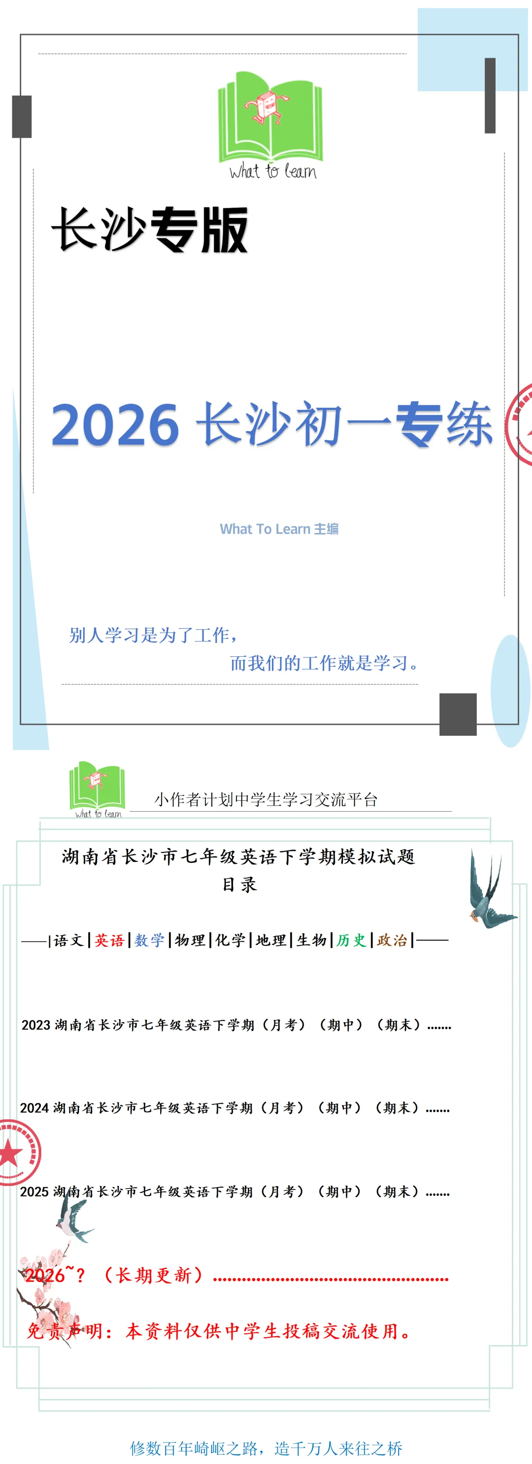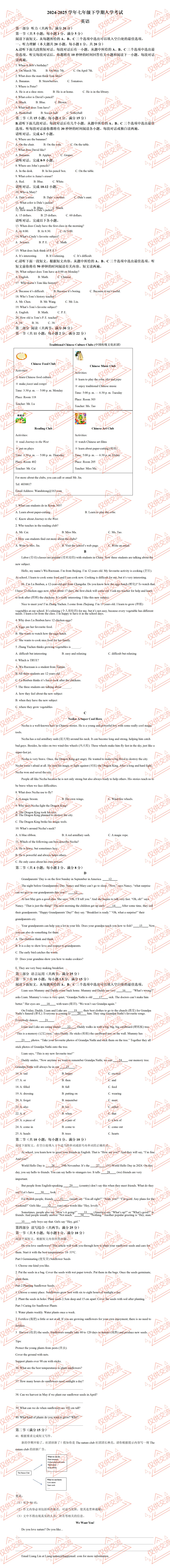 >2026年长沙市各县区七年级英语下册第二学期开学考月考期中期末考前综合训练试题及答案