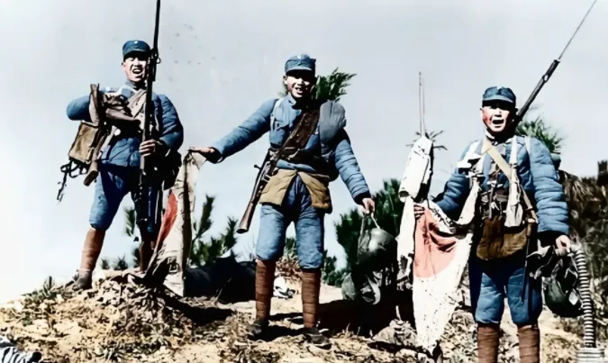 图中这几位穿蓝灰军装的兄弟手里拎着的家伙叫缴获物,有刺刀挑着的膏药旗,有鼓囊囊的防毒面具袋,还有三八大盖,皮带上挂着弹袋,棉军衣鼓鼓的,看得出寒风里打了个硬仗,站在土包上那神气劲儿是真提气。