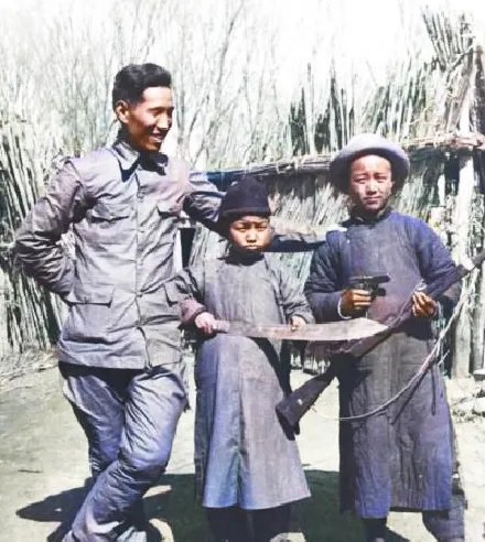 这个笑眯眯的成年人是联络员,身旁两个戴旧帽的孩子举着长枪和手枪,枪托油亮,衣服是粗布长衫,袖口磨白了,这会儿正让他们“摆个造型”,孩子手腕有点发抖,嘴却抿着,像在憋笑。