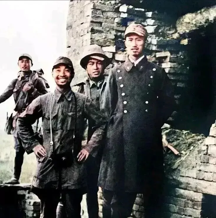 这个穿着双排扣大衣站在城砖缝里的,是前线的指挥员,身旁三位战士笑得放松,背后是破损的垛口,砖上泛着潮气,合影来得突然,战士的手还搭在挎带上,像随时准备冲出去,这类照片总让我想起一句老话,“打仗打的是人心”。