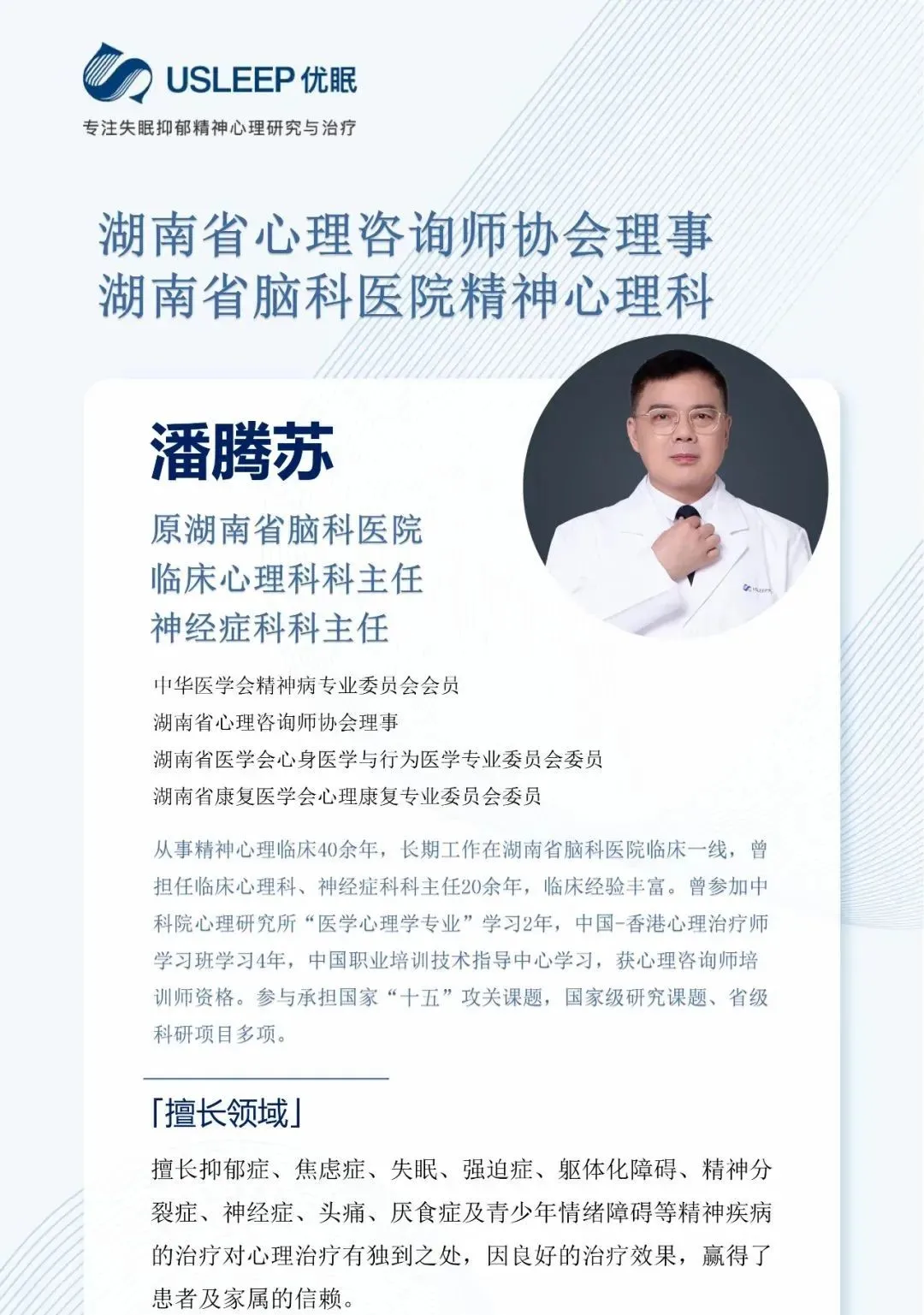 长沙优眠精神心理科专家均为全国排名靠前的主任及副主任医师,正副高级教授,人才规模位居优眠医学中心首位。长沙优眠医学中心精神心理科坚持为患者提供适合的医生团队、优质的医疗服务、靠谱的预后康复、专业的诊疗方案。