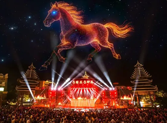“非遗+国潮”,穿越大唐过新年!天官赐福巡游、古风游园游戏、盛唐马术体验、非遗打铁花、无人机天幕秀、还有天马+冷焰火组合飞行等环节,再现千年唐风雅韵。