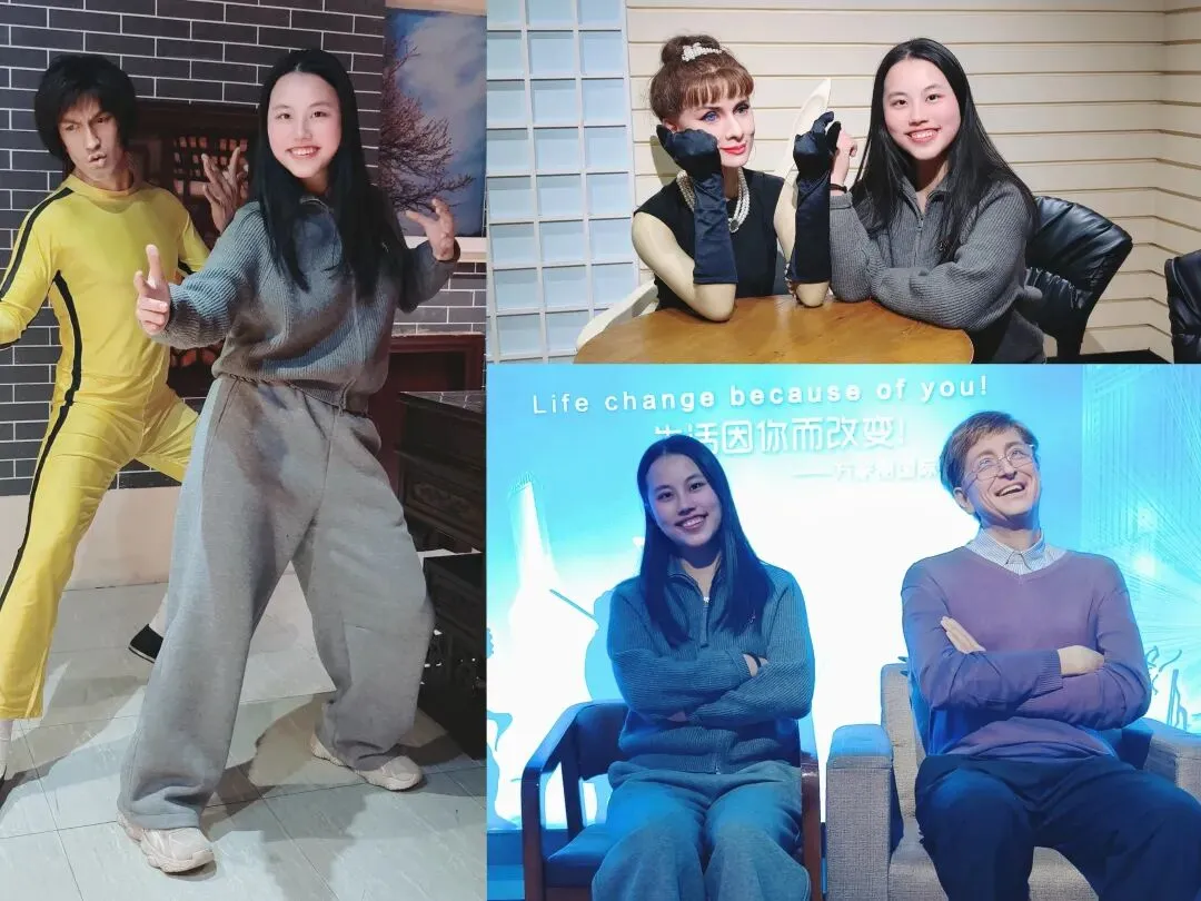 娃和婆婆在蜡像馆里拍照拍得不亦乐乎。