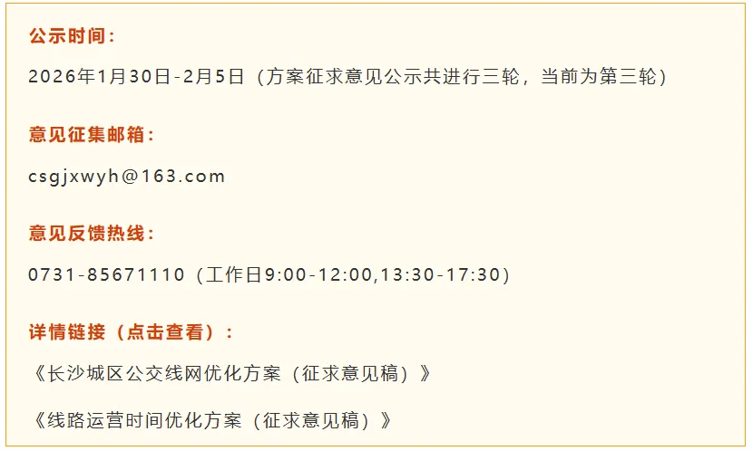 第三轮公交线网优化方案开启!@市民朋友们,长沙城区公交线网优化方案于2025年11月28日 - 12月4日完成了第二轮公示,期间共收到来自社会各界的338条宝贵建议。经分类处理、逐条研究,并充分征求各区县交通运输局意见,直接采纳与优化方案相关且条件成熟的建议27条,通过调整其他线路优化方案间接满足出行需求的建议58条。据此,拟对原优化方案中23条线路进行调整,其中新增优化13条、调整优化4条、撤销优化6条。本次未采纳的相关意见,将待道路通行条件、站场需求等配套设施成熟后,在未来线网优化工作中予以采纳应用。现在,公交线网优化方案征求意见公示进入第三轮,请市民朋友们继续支持,提出宝贵意见。