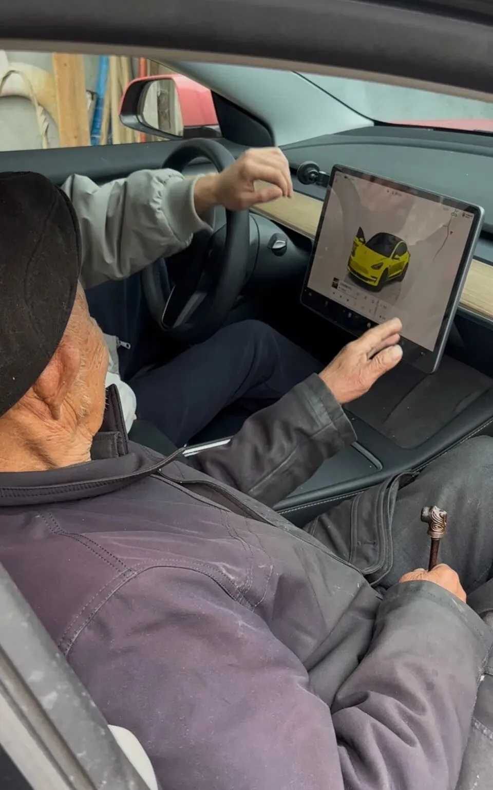 小叶坐在新车驾驶位上,爷爷坐在副驾,对着车里的大屏幕一脸新奇。小叶给他讲座椅加热、导航怎么用。爷爷乐呵呵地说,“我的孙子有能力买车了,好高兴啊。”