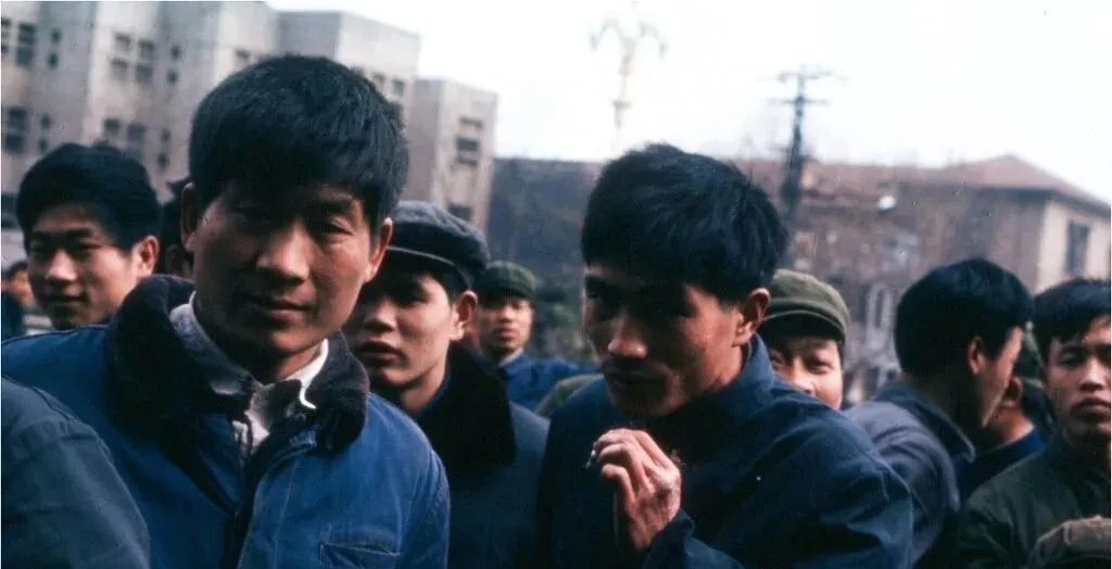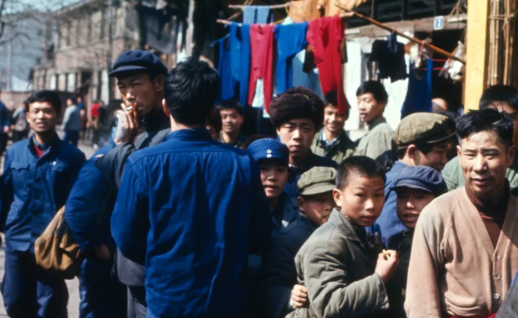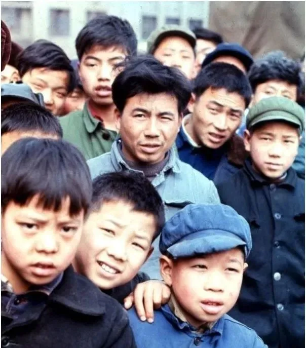图中这拨人围在街口,看架势像是赶集散摊的点位,前头的小伙叼着烟,军绿棉帽压得低低的,蓝布上衣起了毛边,袖口泛白,旁边几个小孩把手揣在袖管里,眼神直巴巴盯着前头的热闹,那会儿消息都靠巷口一传十十传百,谁家买了收音机,谁家换了新自行车,站一会儿就全知道了。