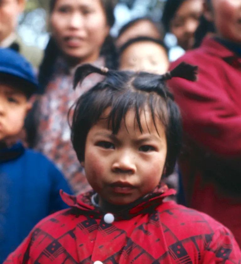 这个小姑娘穿的叫小格子棉袄,红底黑纹,一排白扣子在胸口,脸蛋冻得通红,额前碎发被风吹得立起来,妈妈在后头护着她,嘴里嘀咕一句别往外冲,长沙的冬天潮冷,棉袄要塞得鼓鼓的才顶用。