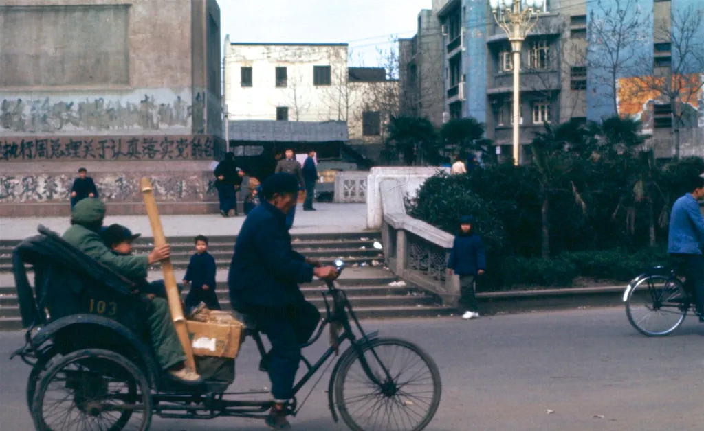 这张里头的交通工具全在这儿了,前面是老式三轮,木靠背上刷着号码,车斗里横着一根长竹竿,估摸是挑担的扁担,司机腰微微弯着,一脚一脚踩得稳,旁边的二八大杠飞一样掠过去,那时候路权在腿上,谁脚上有劲,谁就先到。