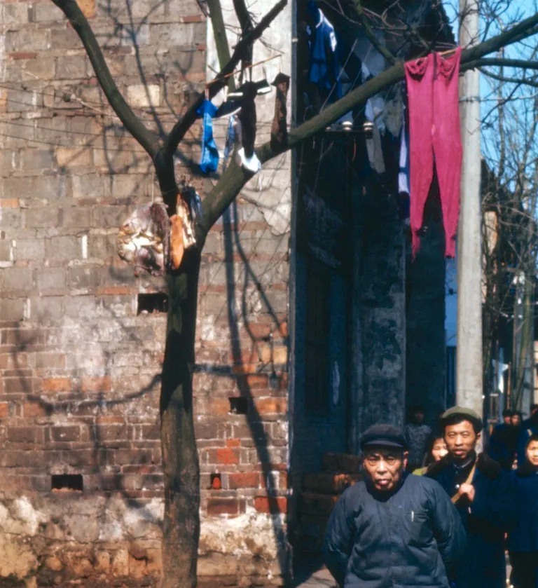 这招叫借树晾衣,赤砖墙边一棵细树杆,袜子长裤一股脑挂上去,枝杈低就用竹竿挑一挑,冬天的阳光难得,谁都想着多晒一会儿,奶奶说衣服要见见太阳,人才不生病。