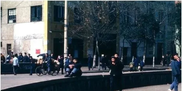 这处半圆形的水泥台坐着几个人,脚边停着一辆驮货的自行车,远处墙上掉了皮,风一吹扬起灰点,孩子跳上台沿跑一圈,大人不吭声,眯着眼晒太阳,街心的慢悠悠,就是那个年月的节奏。