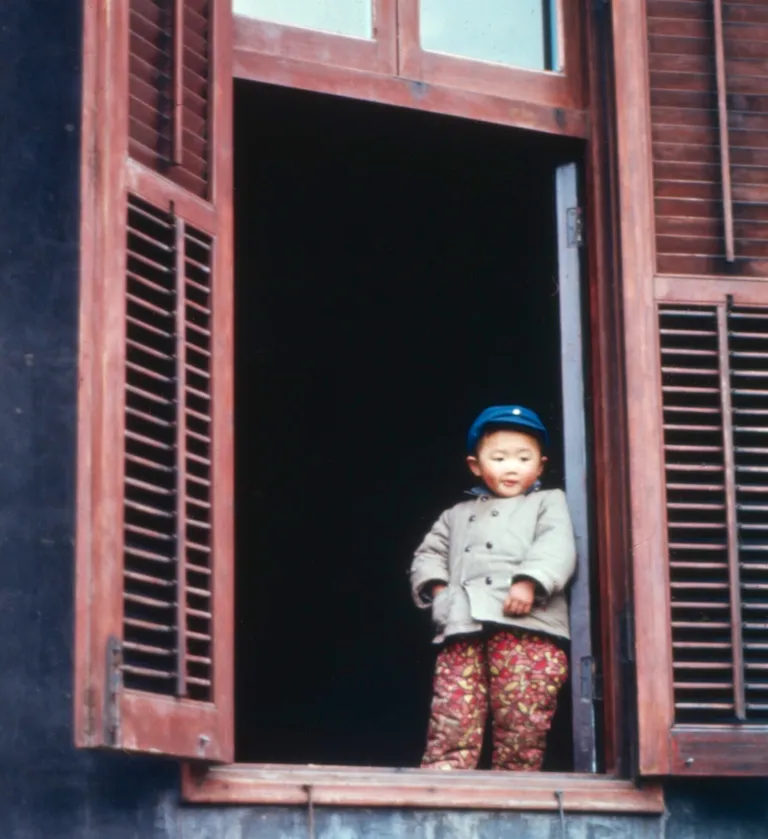 这个木百叶窗开得大大的,窗台很高,站着的小男孩戴蓝帽子,棉裤是红底碎花,扣子系到顶,手背鼓胀胀的,像是刚吃完饭出来透气,屋里很暗,窗外却亮,光一打,他的小脸圆乎乎的,像刚蒸出的白馒头。