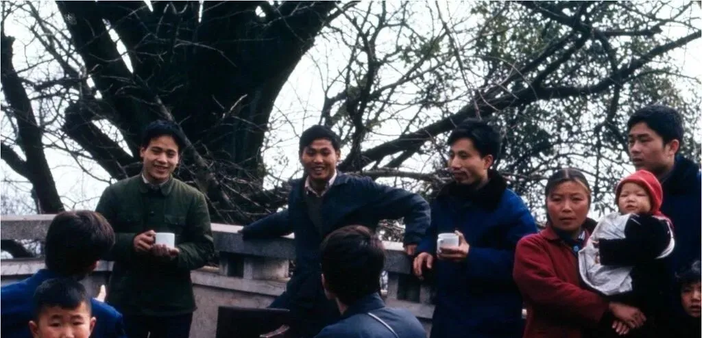 这最后一张在桥边,几位年轻人端着搪瓷缸,靠石栏说笑,旁边的女人把孩子抱在怀里,红小棉袄鼓鼓的,男人说你尝一口我带的茶叶,新下的,另一个回一句别抠抠搜搜的回头请客,几句斗嘴,一缸热气就往上冒,像把那天的冷风都压住了。