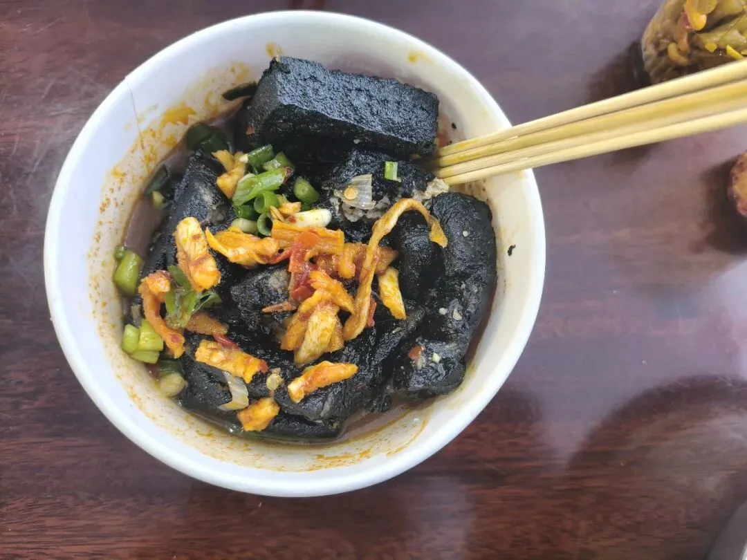 店里排不上队,我在小摊上买了一碗臭豆腐,小份的,15块钱,9片。