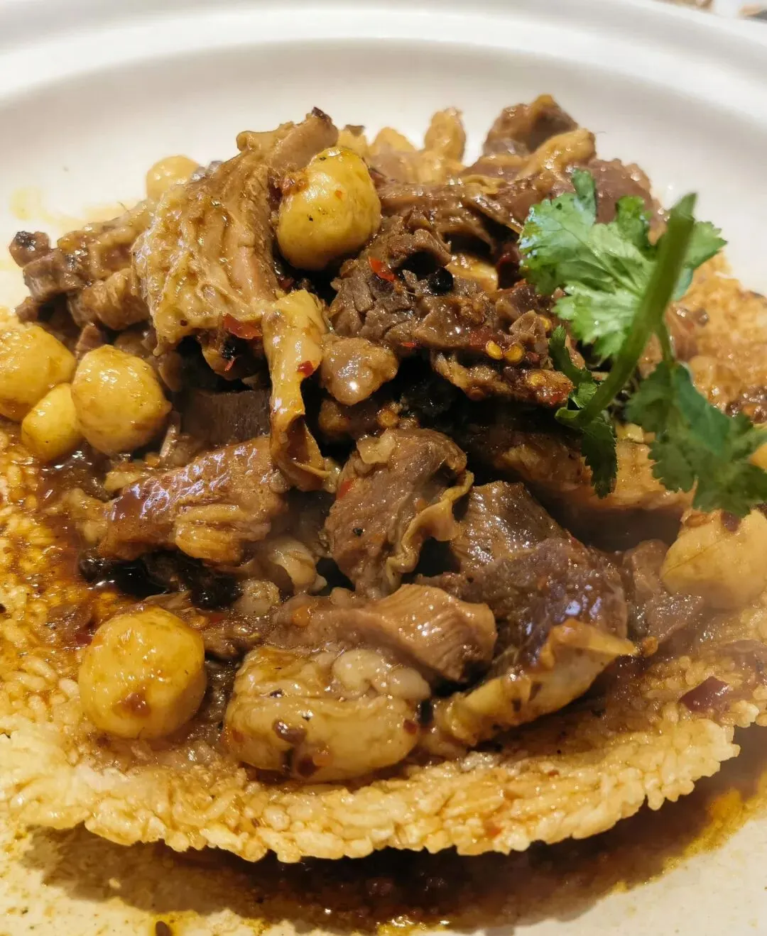 锅巴牛腩,咸香软烂的牛腩放在脆脆的锅巴上,锅巴吸收了牛腩的汤汁,要趁热快点吃,锅巴就不会被泡软,喜欢!