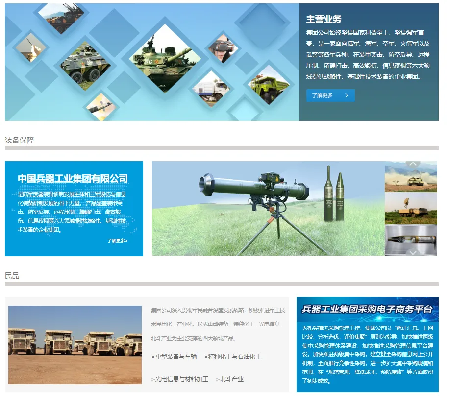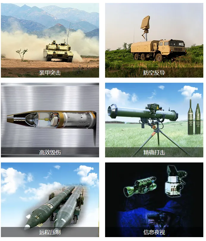 兵器工业集团始终坚持国家利益至上,将装备保障放在首要位置,是各大军工集团中唯一一家面向陆军、海军、空军、火箭军、信息支援部队以及武警公安提供武器装备和技术保障服务的企业集团,除了为陆军提供坦克装甲车辆、远程压制、防空反导等主战装备之外,还向各军兵种提供智能化弹药、光电信息、毁伤技术等战略性、基础性产品。