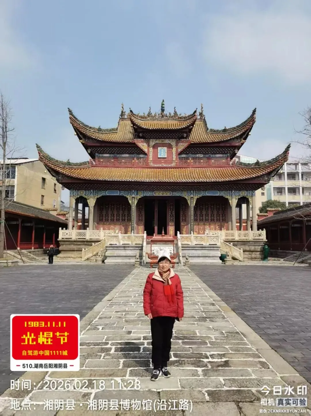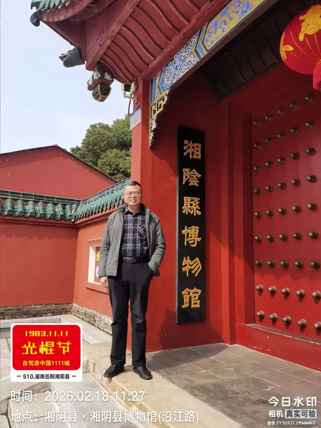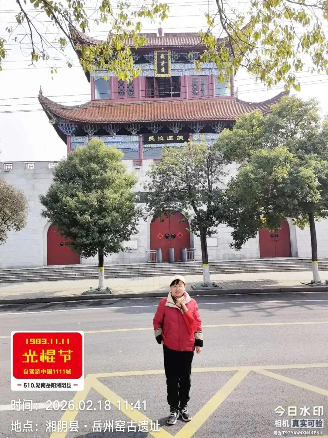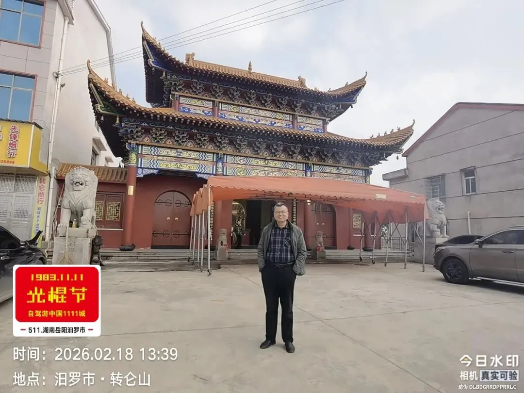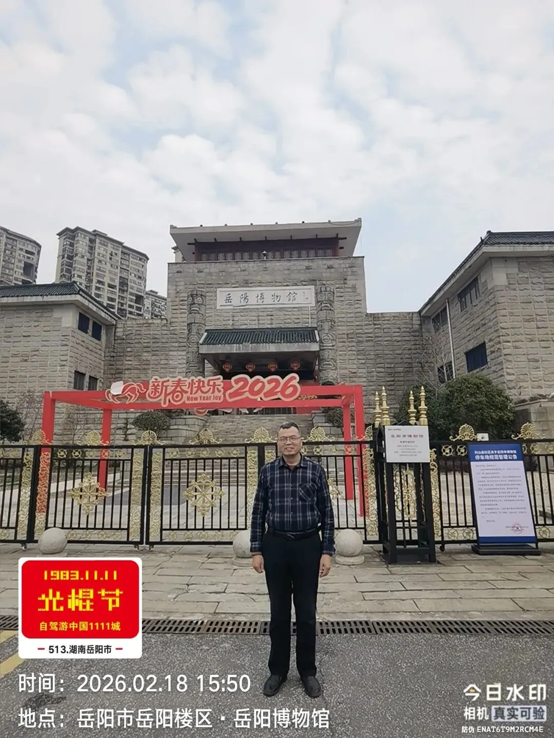 从侧门进入这座2020年重建的松柏寺,主轴线上天王殿、大雄宝殿、藏经楼一字排开,建筑宏伟。长沙县毕竟是个小县城,让我感到意外的是这寺里还有500罗汉堂,可以数罗汉。当然我没有数,人生已过花甲,世事早已看透。2024年国庆节期间和一群朋友开车来过湘阴县,当时去了湘阴文庙、岳州窑遗址博物馆、左宗棠文化园、左宗棠纪念馆等,就是没有来过湘阴县府,今天算是如愿以偿。湘阴县博物馆就设在湘阴文庙里面,因前年来看过,这次主要是带前年没来过的老婆来看看。虽然岳州窑遗址博物馆今天不开放,但我前年就参观过了,加上老婆对这不感兴趣,所以我们没有遗憾。前年国庆节期间也来过汩罗市,只是当时走的是另外一条路,没有到过县城,而是去的长乐古镇(回龙门)、屈子文化园等。在去“罗子国城遗址博物馆”的路上看见了转仑山,就停车下来看了一下,发现这也是一座庙。还看见了一对母女在此烧香求签问祸福。专程来参观“罗子国城遗址博物馆”,可它今天不开门,我有点遗憾。我是第一次来到岳阳县,可它的博物馆(新墙河抗战史实陈列)也没开门。我来过多次岳阳市,但去的是岳阳楼。首次是国庆节放长假的1999年,最近一次是2024年国庆节,当时那里人山人海,停车场都停满了,车子在距离岳阳楼景区几百米的位置开不动了。没办法,我们就去汩罗市了。今天本来想去岳阳楼故地重游的,手机一导航,通往岳阳楼的道路一片红色,还是算了吧。来到岳阳博物馆,这里除夕、初一、初二闭馆三天,明天(初三)才开门,看来还是无缘啊。我们在博物馆附近的洞庭湖旅游度假区(南湖景区)转了一下,看了一下。开车返回武汉时在高速公路“洪湖服务区”吃了一盒方便面,再开车回家。就结束了这次用时44天、新到达122个(城)市县、行程8646公里的“光棍节自驾游中国1111城”的活动。