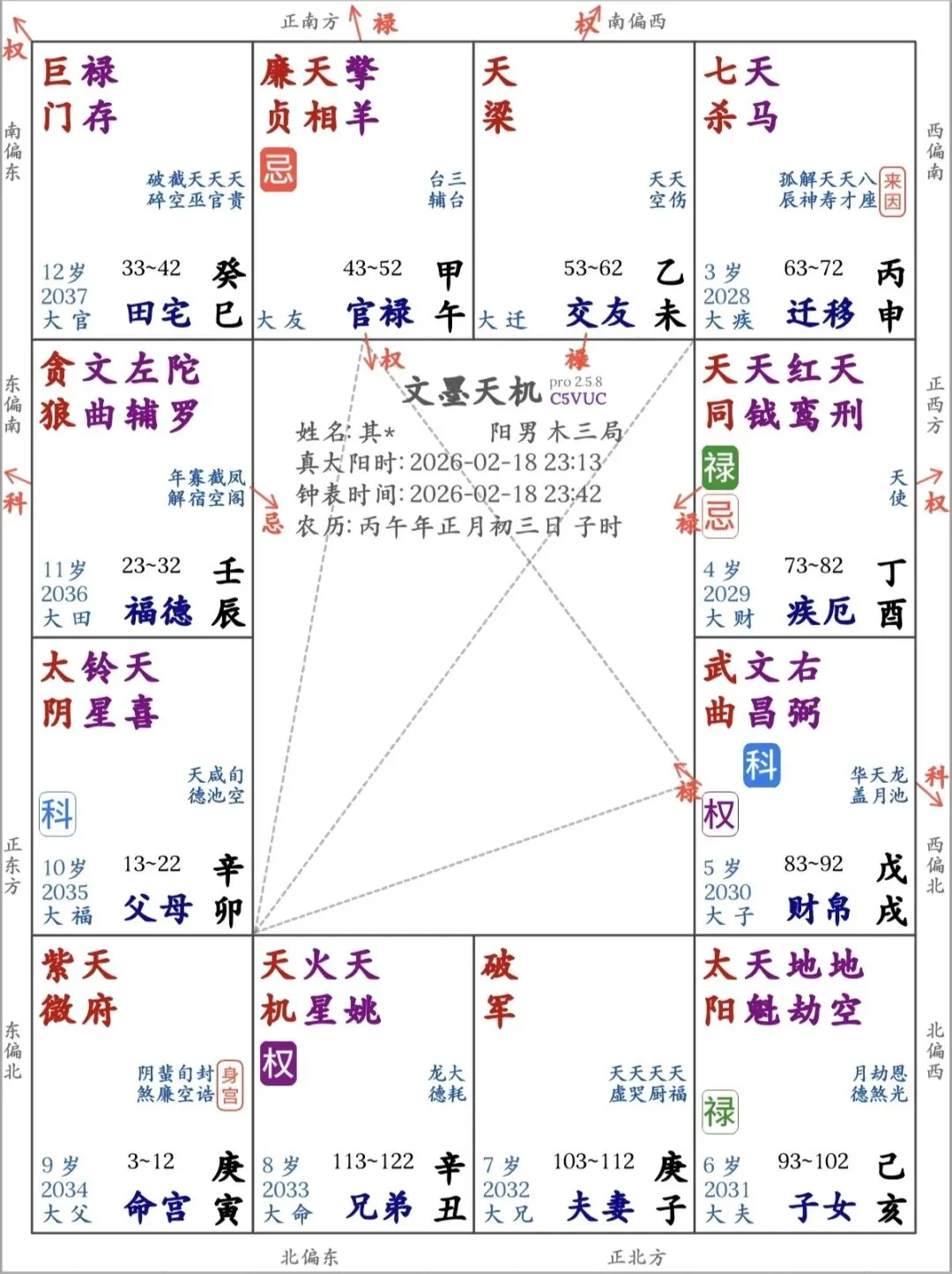 起盘看一下便知,简直妙不可言,“主星坐主宫”的格局原来真实存在。巨门是田宅主,这巨门星恰好落入田宅宫,巨门巨门,顾名思义,超级大楼,配合禄存星,确实是栋金碧辉煌的豪门。紫微天府帝王星坐命宫,尊贵无需多言。更有趣的还在后面,天同化禄坐疾厄宫,天同顾名思义与天同乐,掌管饮食,疾厄宫掌管身体,天同星本身就是疾厄宫的宫主;贪狼坐福德宫,福德宫掌管玩乐,贪狼星擅玩乐,自身也是福德宫的宫主;二者结合起来,这可不就是集吃喝玩乐于一体的综合商场嘛。