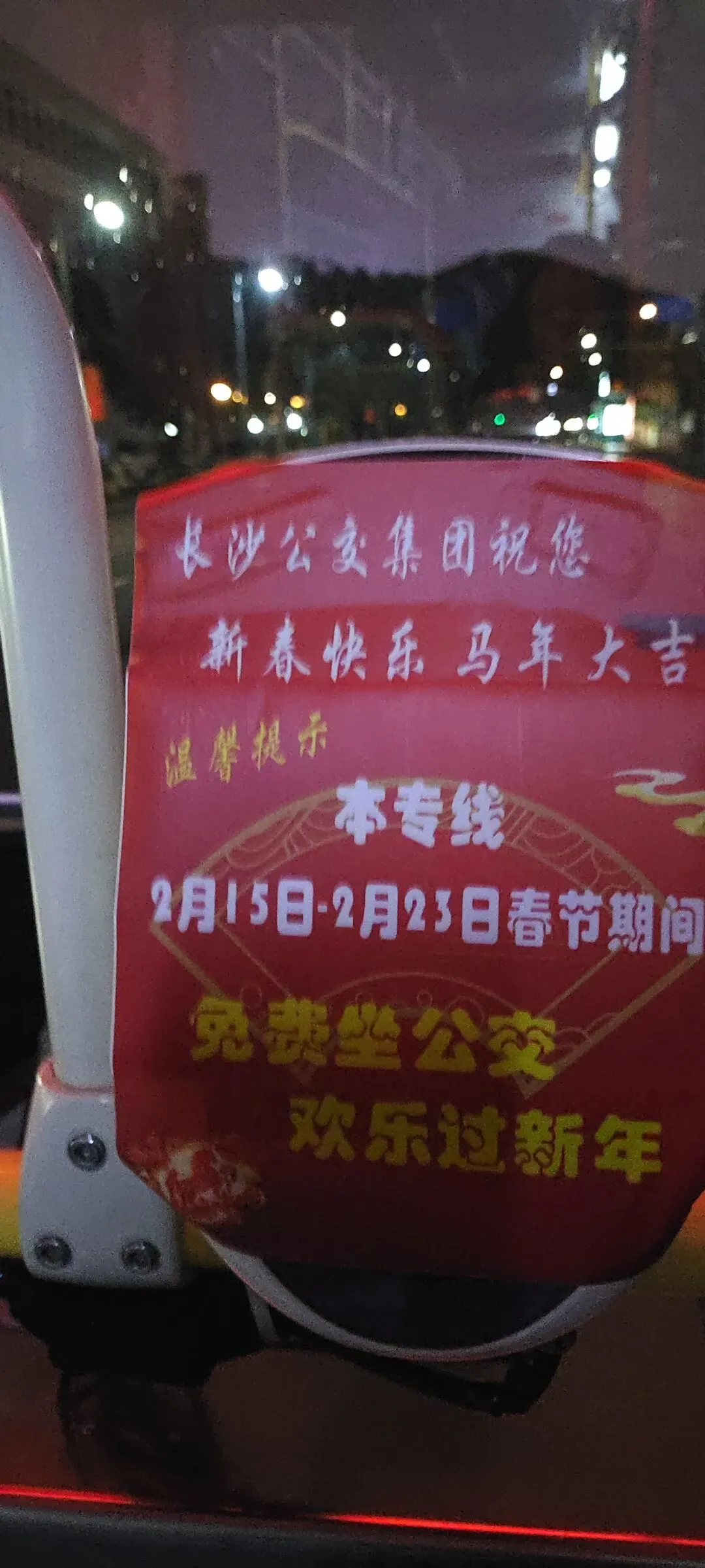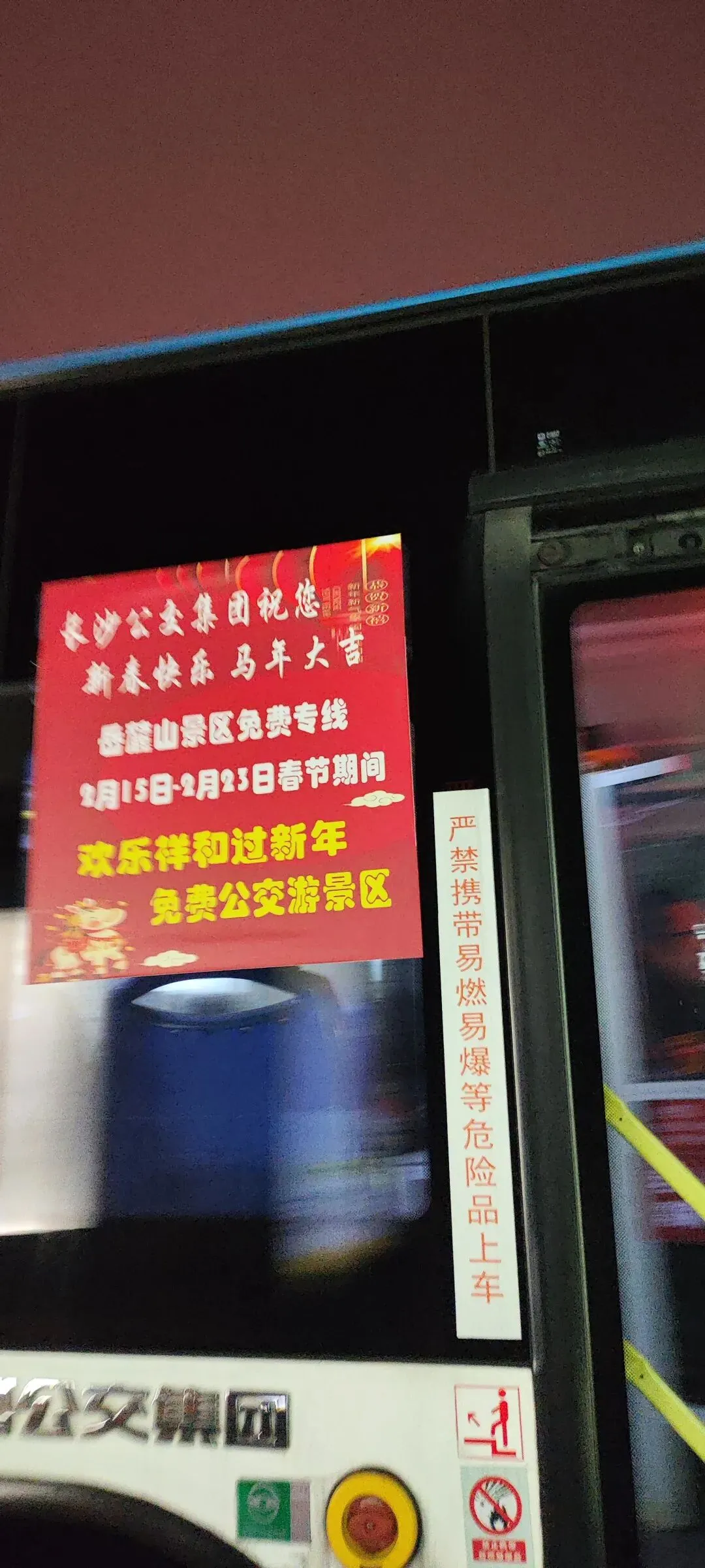 晚风轻拂岳麓山巅,灯火漫卷湘江两岸,晚饭后,漫步校园,仍然是人山人海,走到自卑亭周边,看到每一台公交车前贴有免费的红幅,逐走到湖南大学地铁站一看究竞,正好有一辆大科城3号线经过,司机师傅热情说“欢迎乘坐免费公交”,好奇心驱使,爬上车与司机师傅聊了一下,了解到长沙春节期间共有72条免费公交。