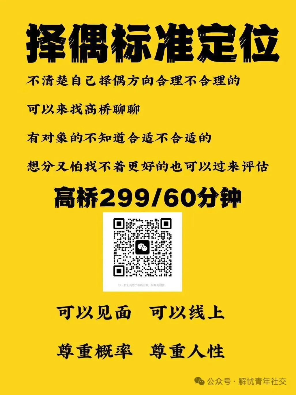 如果你正卡在择偶迷茫期,不知道如何精准定位、打破竞争困境,也可以找我们做择偶定位或一对一私人择偶规划,结合你的自身条件和市场情况,定制专属脱单思路,帮你避开误区、高效遇见同频的人。