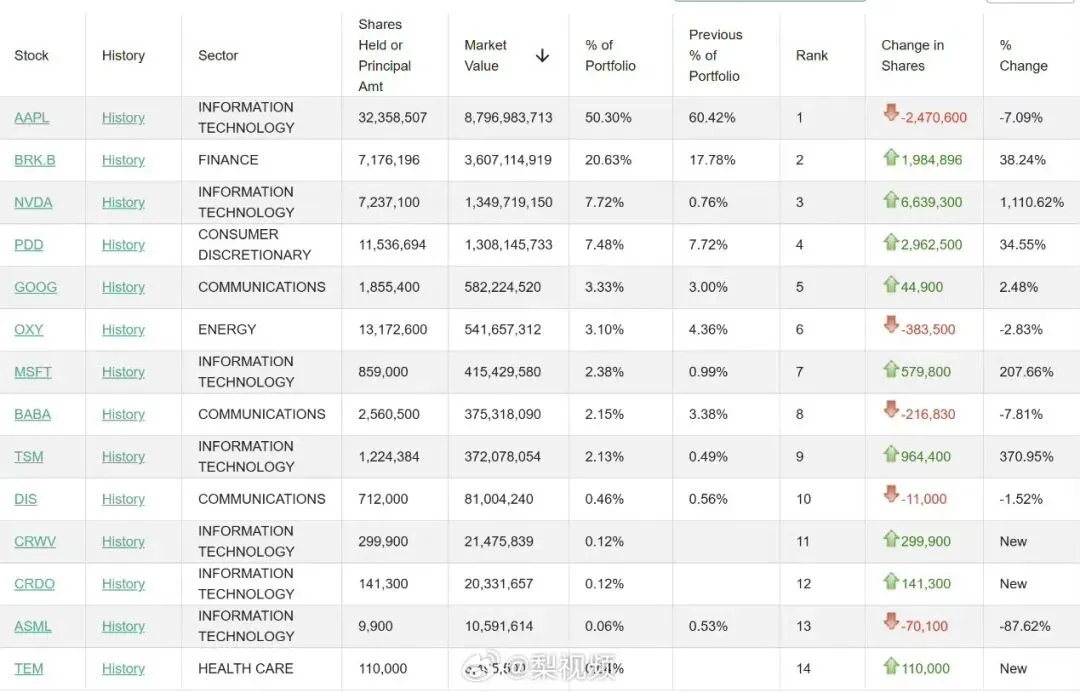 然后段总的持仓今天也公布了,想抄作业的可以抄一下,不过还是不建议抄,因为跟不上。大概看看就行了,就是减持了苹果(即使减持也有50%多),加仓了伯克希尔,英伟达和拼多多。