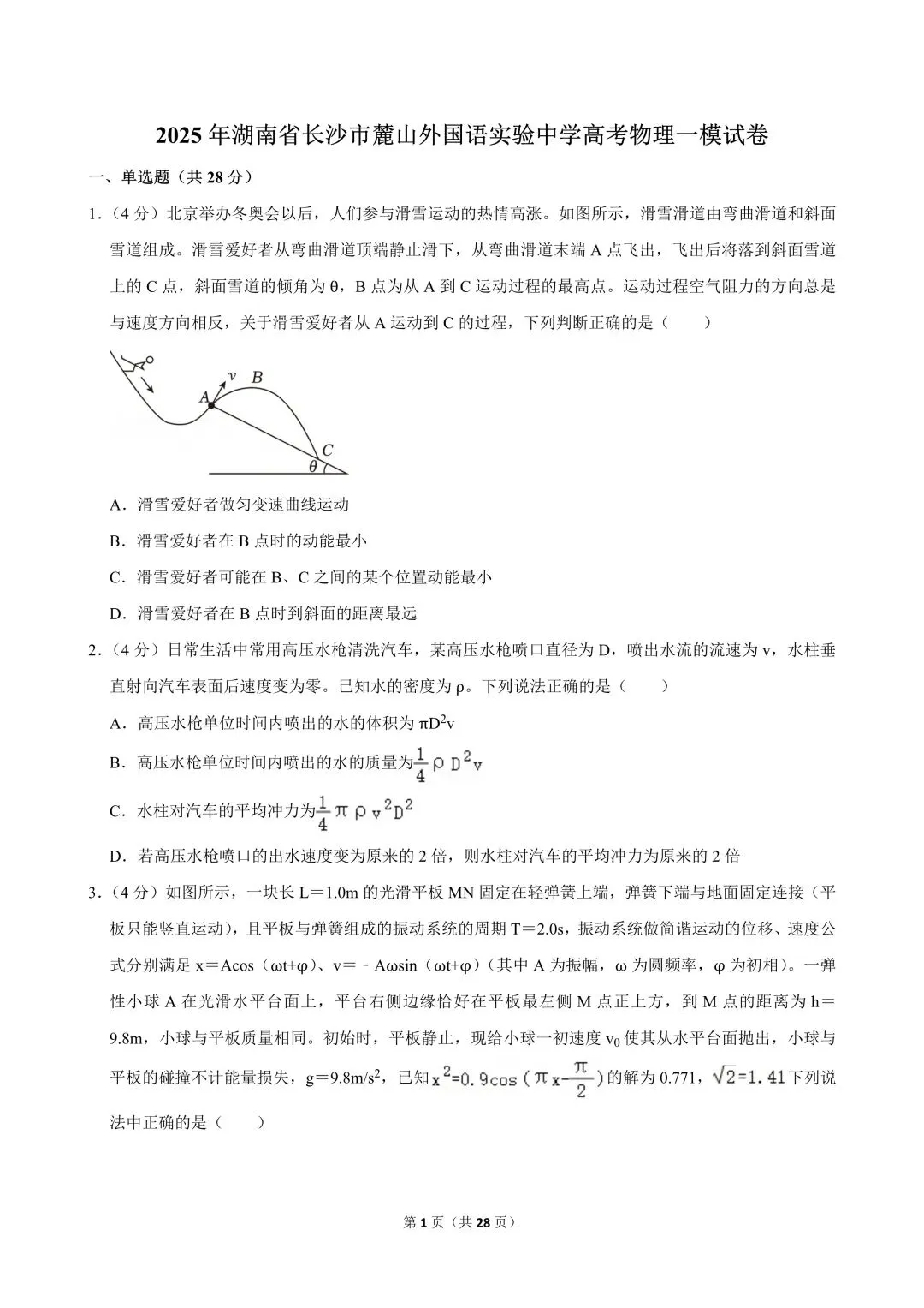 >高三试卷|2025年湖南省长沙市麓山外国语实验中学高考物理一模试卷