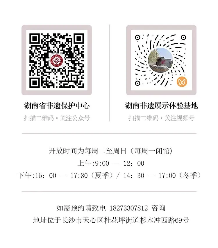 湖南省非物质文化遗产保护中心微信公众号平台将从即日起至春节期间,连载推出“非遗里的湖南”展览里,每一个精选湖南非遗代表性项目的现场设计和展示的精品作品,敬请期待。