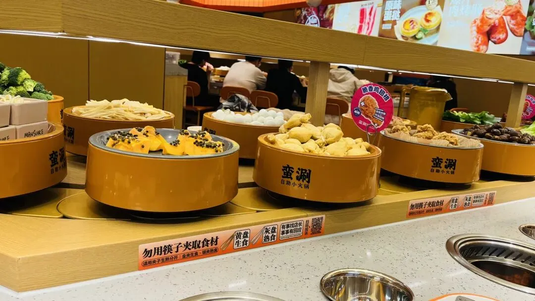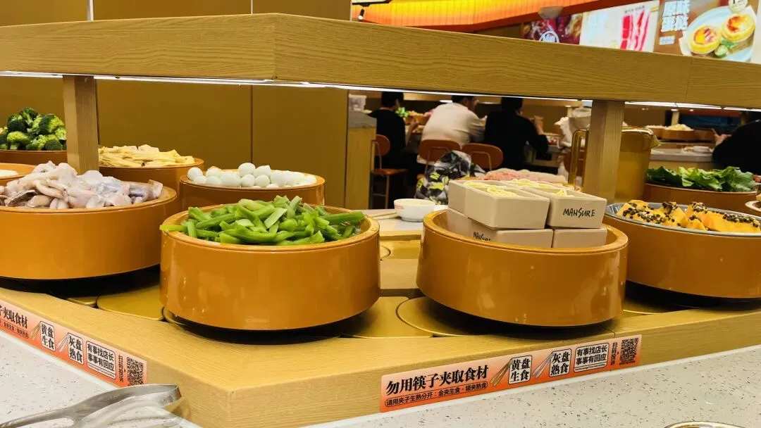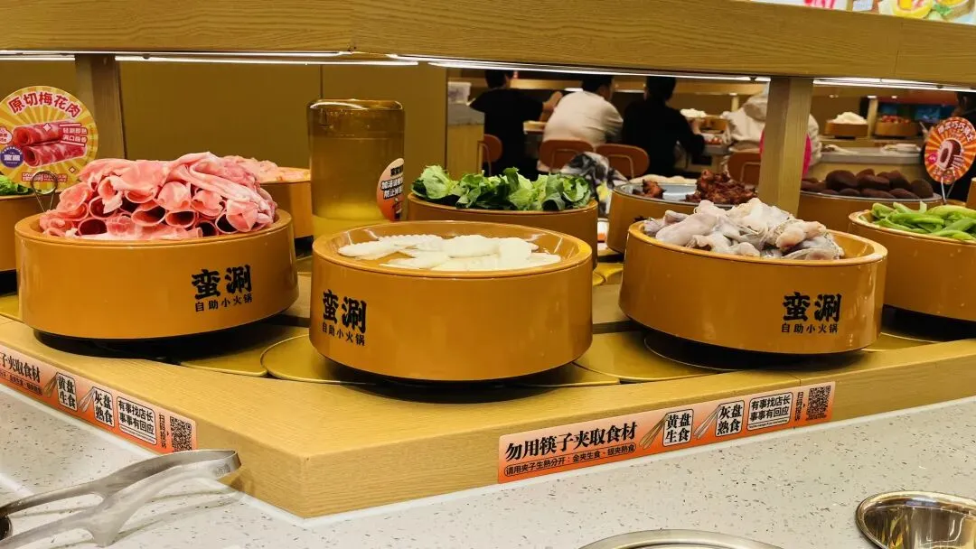 我扫了一眼,以前在苏州吃类似小火锅的时候,我觉得不卫生。我亲眼看到几个孩子直接用筷子夹盘子里的食物,夹了半天没夹到,菜又转前面去了。今天这家旋转小火锅也不能避免这种行为,只是转盘上有一行大字,提醒顾客不要用筷子夹食物。