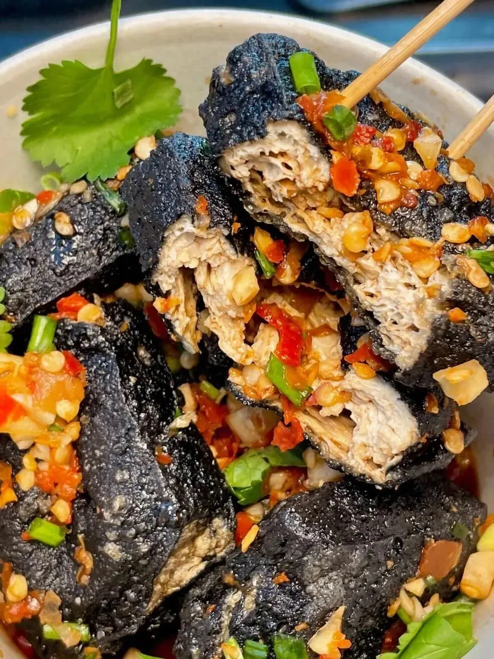 臭豆腐得找那种铁皮摊子,老板戴着袖套,铁锅里的油“滋滋”冒泡。黑黢黢的豆腐块炸得鼓起来,用签子戳个洞,往秘制卤汁里一泡,再灌上蒜蓉辣椒——咬下去的瞬间,汤汁在嘴里爆开,外脆里嫩,香得人直咂嘴。别嫌它黑,长沙人懂:“越丑越香,这才是正经手艺。”