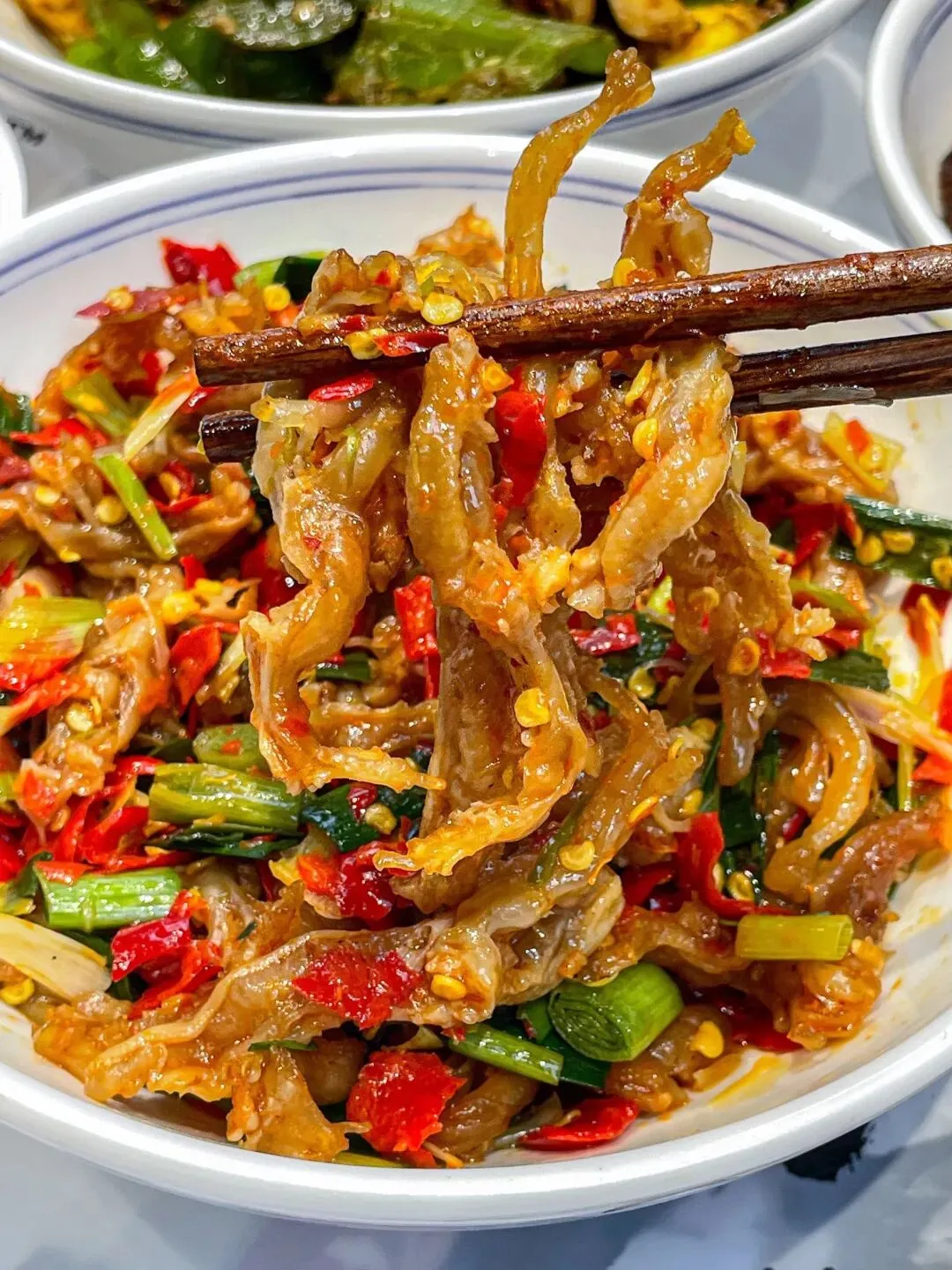壹盏灯的鸭掌筋是出了名的“辣王”。红辣椒堆得比菜还多,嚼一口,辣劲直冲脑门,眼泪鼻涕一起流,可筷子就是停不下来。邻桌的小哥边擦汗边说:“老板,再来碗冰粉!越辣越想吃,这才是长沙菜!”